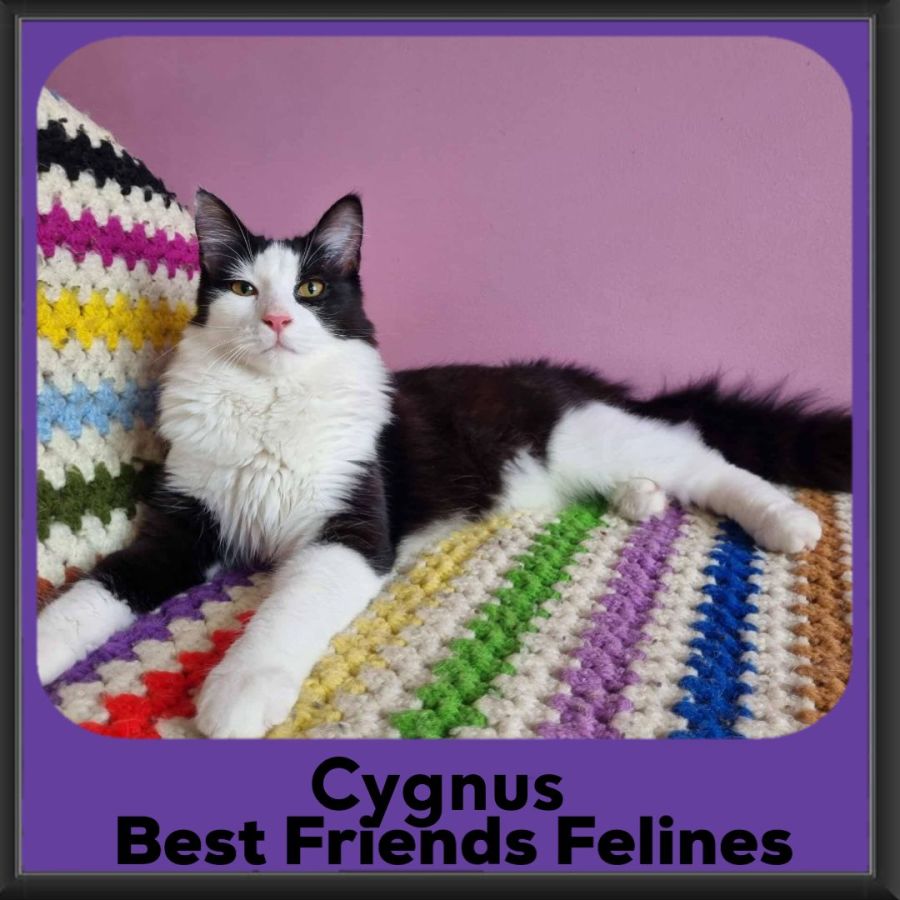 Cygnus is a confident explorer and was quick to explore his home and say hi to everyone. He’s quick to try and make friends with the other cats, but found the large dog a bit intimidating at first. He hasn’t met any kids since being in care, but with his gorgeous personality he’s bound to be great with sensible kids.