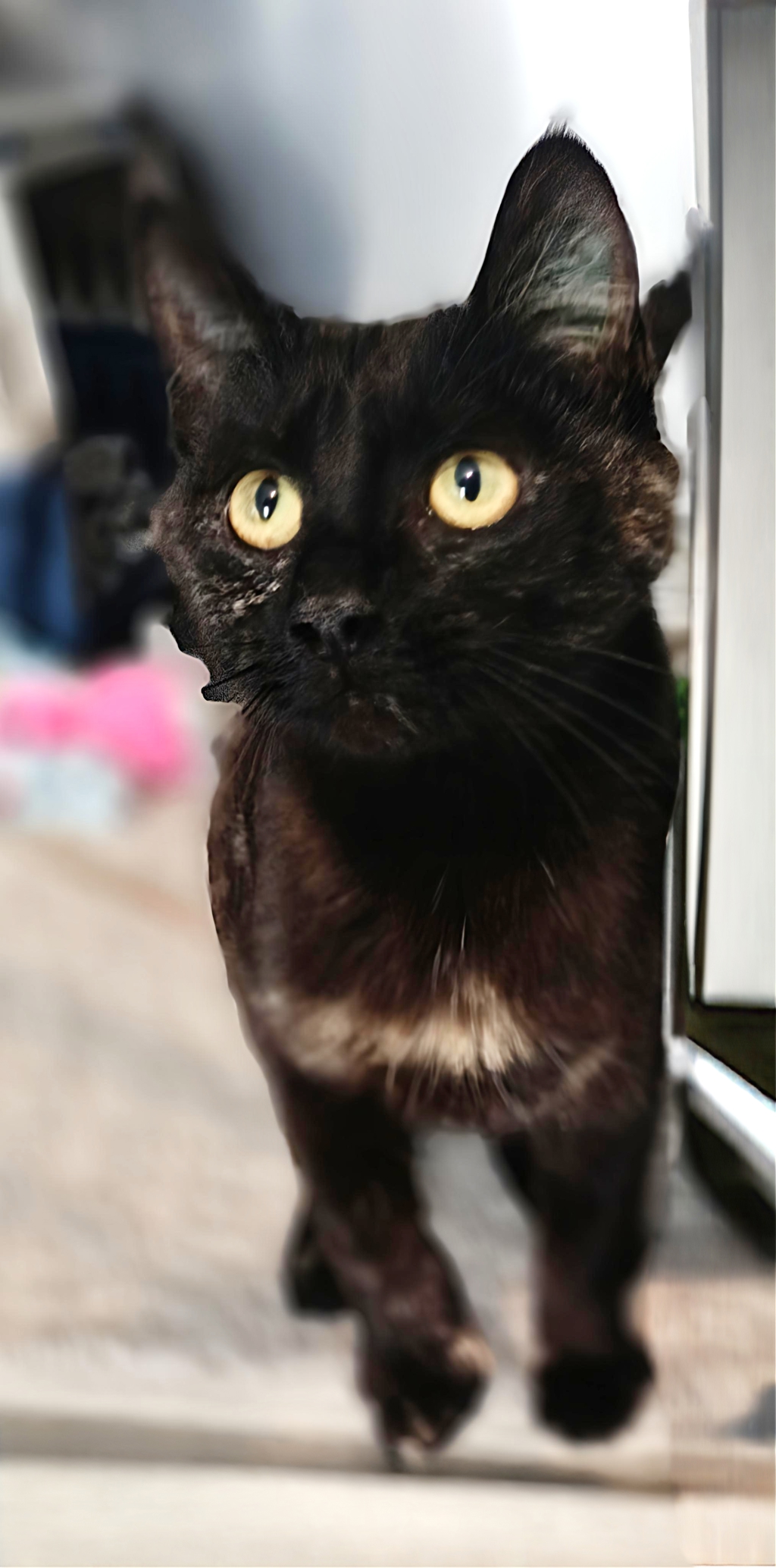 Sabrina is a stunning Black Tortie older kitten with a big heart and an even bigger personality. She's incredibly social and loves everyone she meets-humans and furry friends alike. This busy girl is always on the move, full of energy and curiosity, eager to be involved in whatever is happening around her. She'll happily supervise mealtimes, playtime, and every new adventure, and her love of food is a constant driver of her joyful spirit.