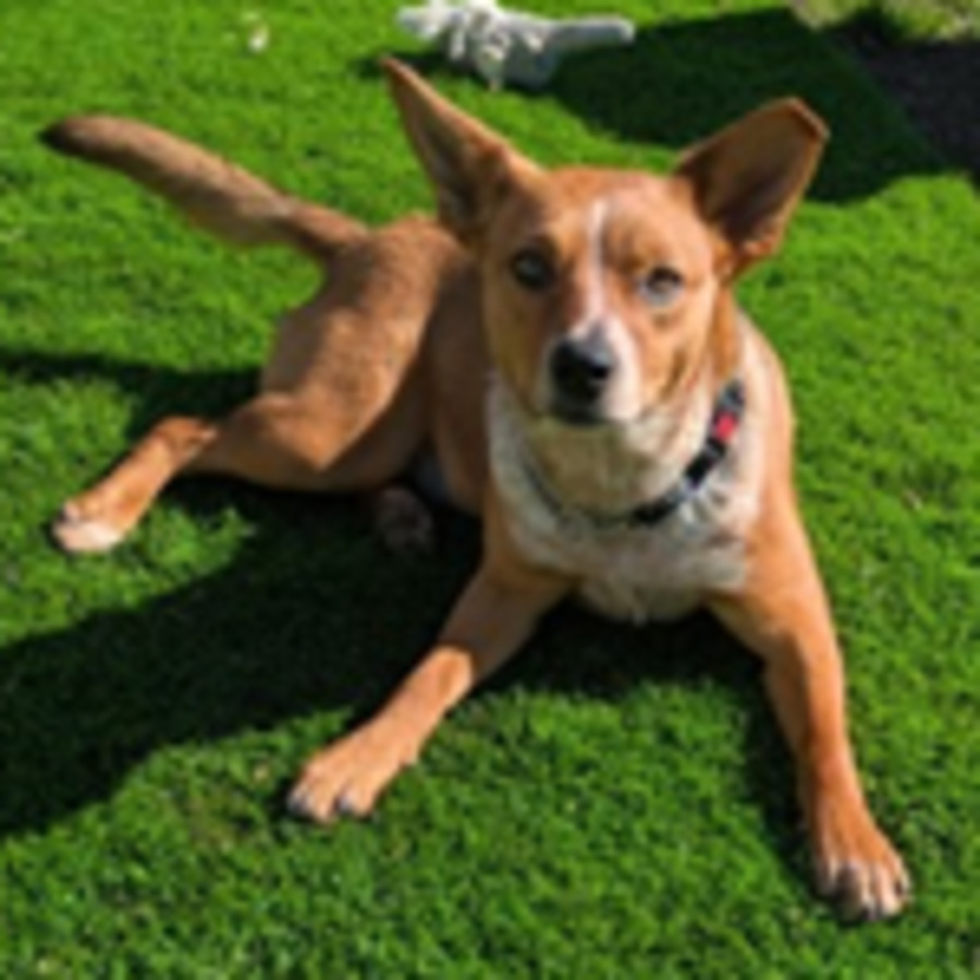 • Loves other dogs and enjoys playtime, though she can sometimes be dominant with one dog; other times, she’s the best of friends.