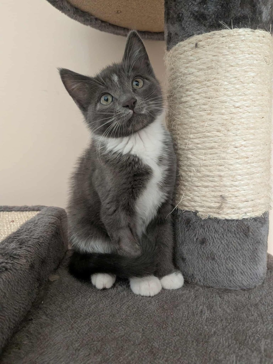 Triss is a beautiful grey and white kitten who came to us from the pound with her brother, Tobias. From the moment they arrived, this sweet pair have brought warmth and gentleness to everyone who meets them.