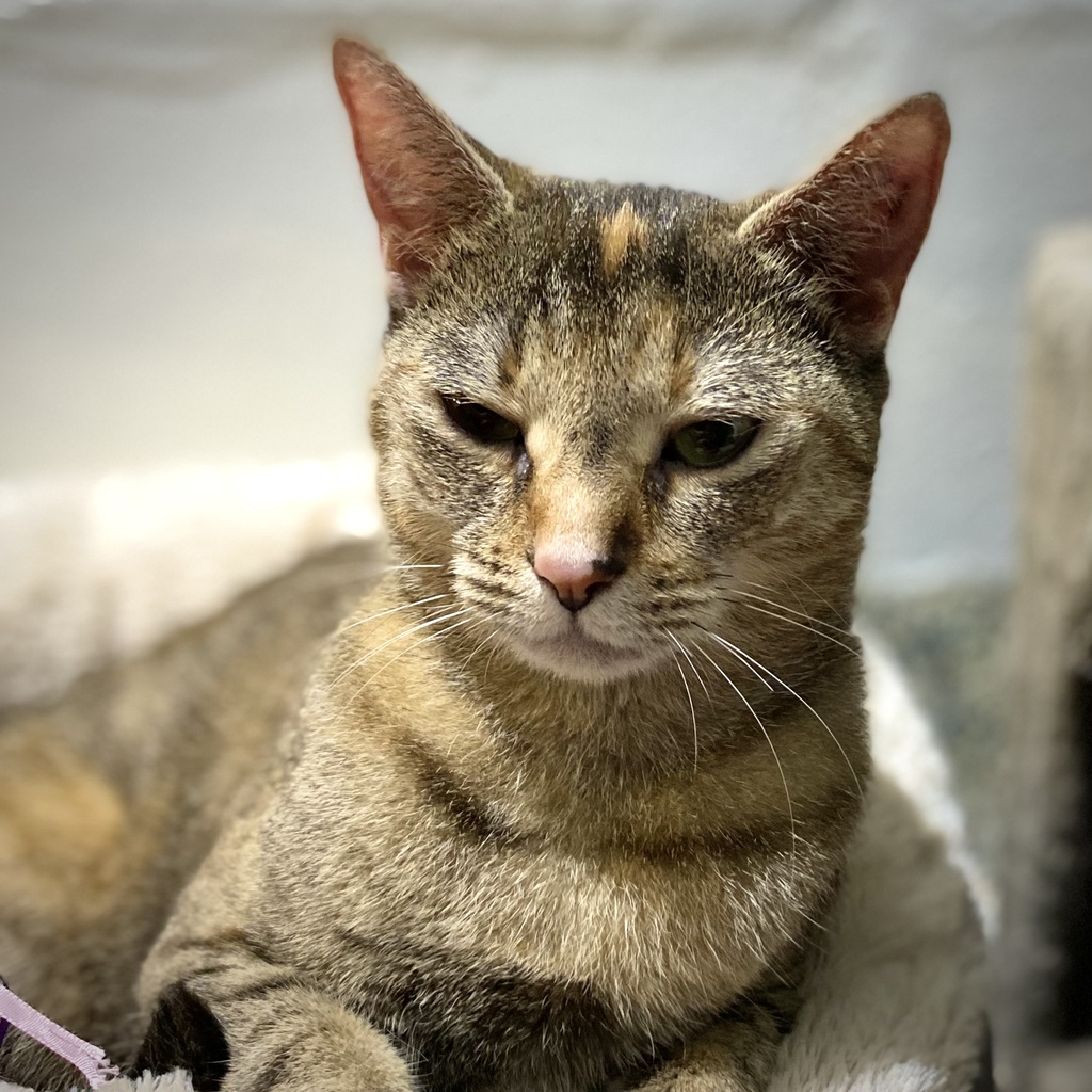 Please meet our Cordelia. Cordelia is a very pretty lady, who's searching for her new, loving home. Please, could it be with you? After all, how could you resist her beautiful, green eyes and the little ginger dot on her forehead. Her coat is know as a brown torbie colour/pattern. When she becomes comfortable and trusting of you, her green eyes will seek you out for attention and she'll come running to you with lots of purrs and head bops.