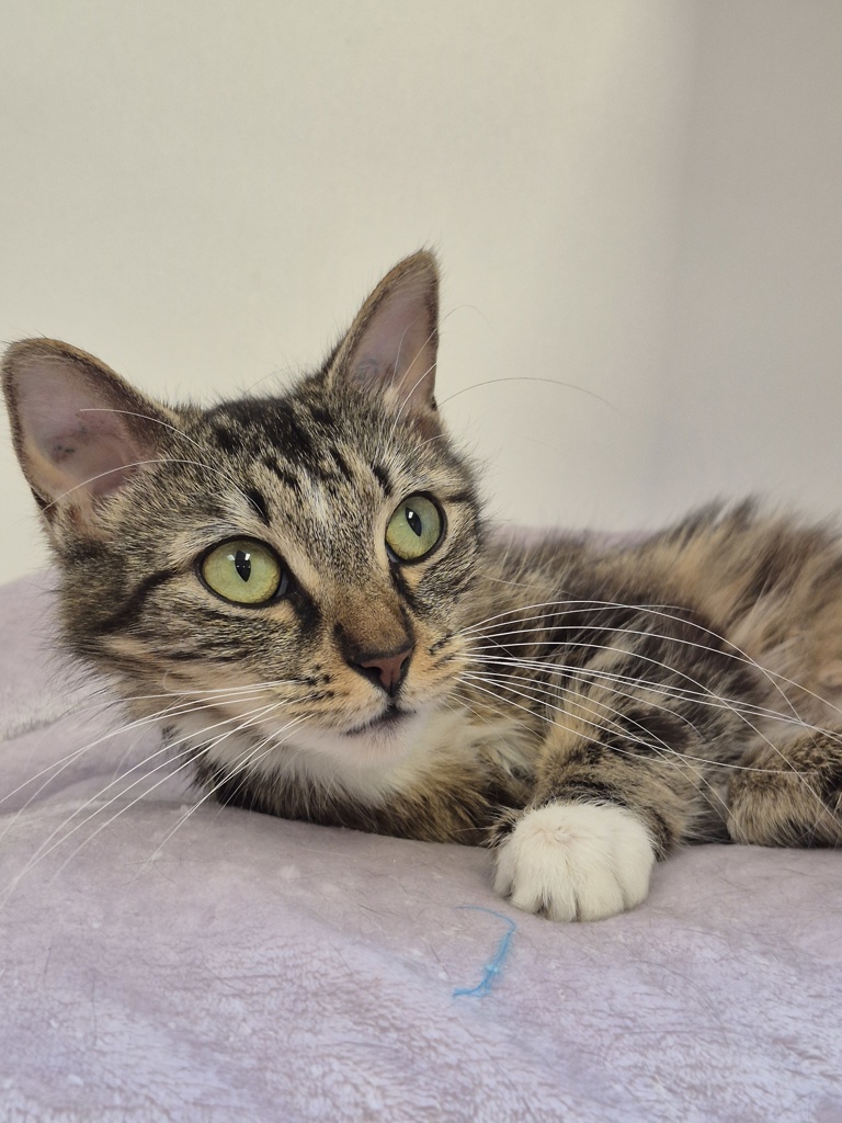 Wattle is a delightful 7-month-old girl with soft, medium-length fur and a sparkling personality to match. She's a funny, playful little cat who loves to entertain with her curious antics.