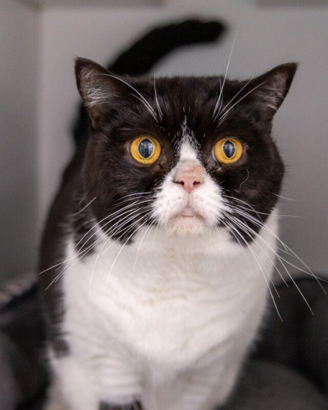 She's not fussy with food and adores her tube treats. She's also friendly with visitors once she's had a moment to say hello. Aggie would thrive in a quiet home with gentle humans who appreciate a sweet, independent cat who'll be your loyal, quirky shadow.