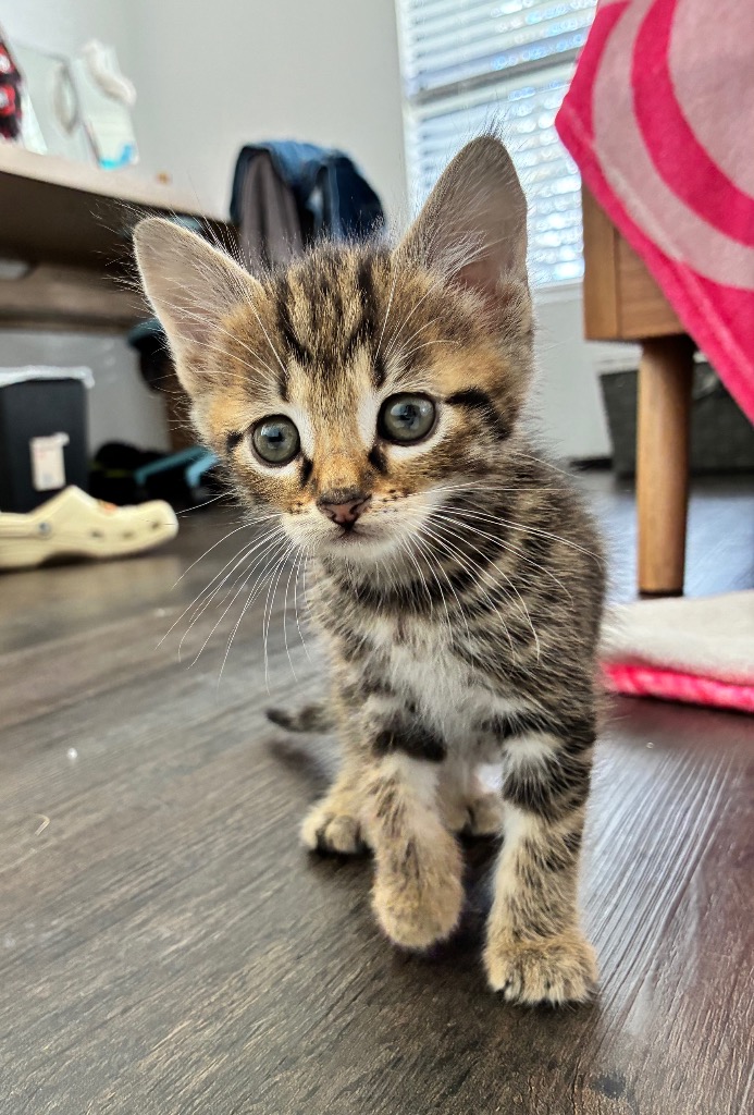 This cheeky kitten is full of bounce and curiosity, always chasing toys (and sometimes her own tail) like it’s her full-time job. Her confidence and personality are still blossoming, and every day she shows a little more of her silly, sweet self.