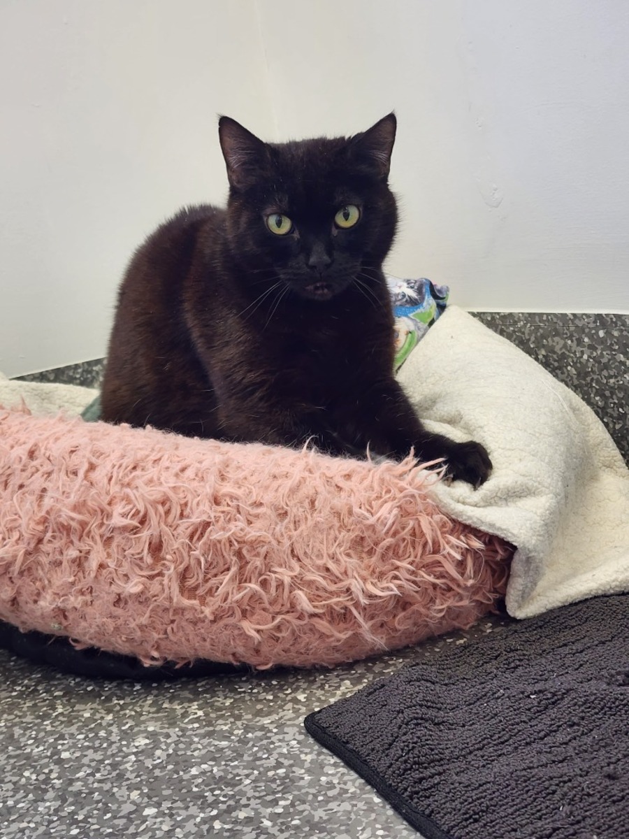 Meet Angelique, a truly one-of-a-kind feline with an undeniable flair for the dramatics. This very special girl has come a long way since her beginnings on the streets as part of a cat colony. Though her early life didn't bring her into contact with humans, she has made remarkable progress in building trust and confidence. Angelique has blossomed into a sweet and affectionate companion, known for kneading her cozy bed beside her human friends while they sit with her. She knows her cat staff and when she has settled, she becomes a gentle presence who enjoys receiving pets.
