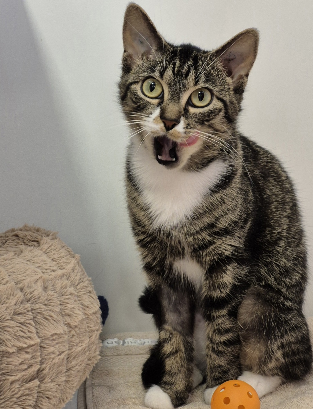 Banksia is a young, affectionate girl with a big personality and an even bigger heart. She's friendly, social, and loves to chat - you'll often find her greeting you with a cheerful meow or a soft trill. This vocal sweetheart adores attention and isn't shy about asking for cuddles.