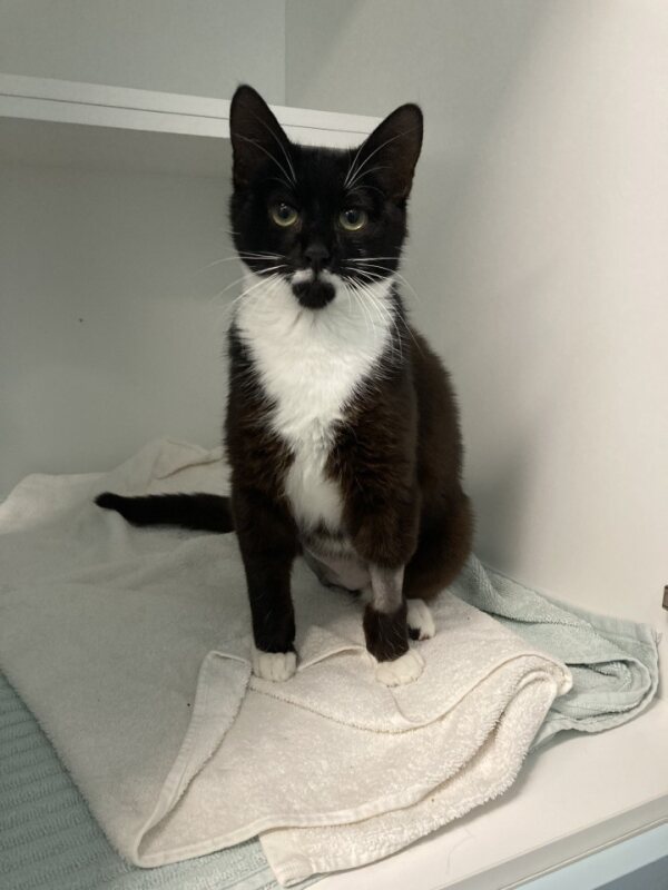 Hi, I'm String Cheese. I'm a male Domestic Short Hair, 1 year old. I was discovered as a stray with a horrific leg injury. I am now recovering from surgery and am starting to feel much better, and ready to find my forever home. I now have a sleek coat, gentle purr, and a curious nose that loves exploring new corners and sunbeams. My energy level is average, so I enjoy a balance of playful moments and plenty of quiet snuggles. I’d do well with adults or older kids who respect my space and give me patience as I adjust. I love soft beds, a sunny window, and gentle brushing. A steady routine helps me feel secure and happy. If you’re looking for a thoughtful companion who will greet you with a friendly meow and a cozy lap, I’m your guy. I’m ready to share gentle purrs, soft head nudges, and lots of affection with my perfect family. Come meet me and see if we’re a match.