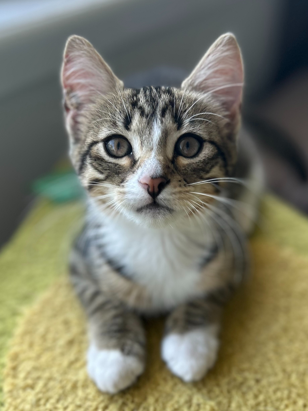 Hi! I'm Chicken! I came into care with my sister Nugget, and together we're Chicken Nugget! We were a bit unsure of people when we first came into care, but after spending some time in foster, I'm super confident now! If you call out 'Chicky Chicky', I'll come running for some pats! I love a good snuggle on the couch too! I'm a very playful girl, wrestling with the other kittens is my favourite! I also love toys and cat scratchers and having my daily naps up high in the cat tree! I'm a big foodie too, and I can get a bit over excited for dinner time and weave in and out of your feet, so you'll have to be mindful of where you're stepping! So, if you think you can give me a loving home where we can snuggle and play heaps then I'm your girl!