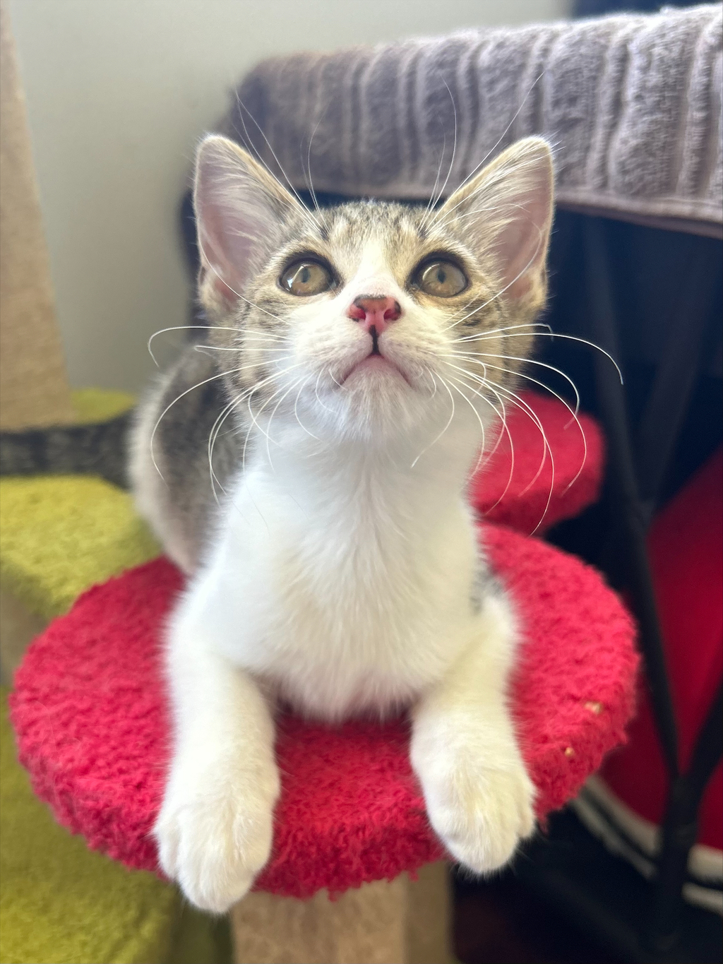 I got the name because of my cute little spots on my nose; I also have the most beautiful long whiskers you've ever seen! I'm a very sweet little girl; I love running up to you for pats and cuddling up in your lap while we watch tv. I was a little unsure of other cats when I first came into care, but I got to spend some time in foster with two other kittens and some adult cats, and whilst I did grumble at the start, I love them now! So, if you have another cat at home, I might take some time to trust them! But I absolutely love running around and wrestling with my kitten friends now! I love food too, and I might even sneakily steal yours so be careful! So, if you're looking for a sweet, friendly companion to share your days with, I'm your kitten!