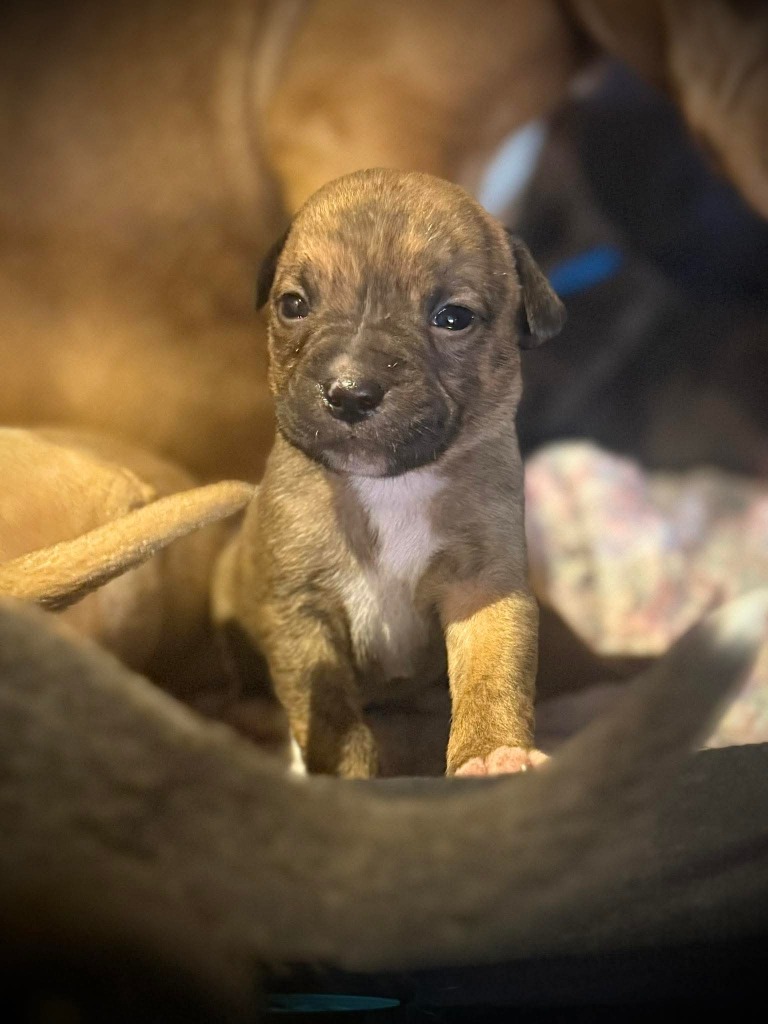 This little one is part of a beautiful litter of 11 puppies (6 boys and 5 girls) who came into care with their mum, a gentle Staffy mix, when they were just a few days old. Dad is unknown. Each pup has grown into a happy, healthy, and sweet-natured youngster now looking for a family of their very own.