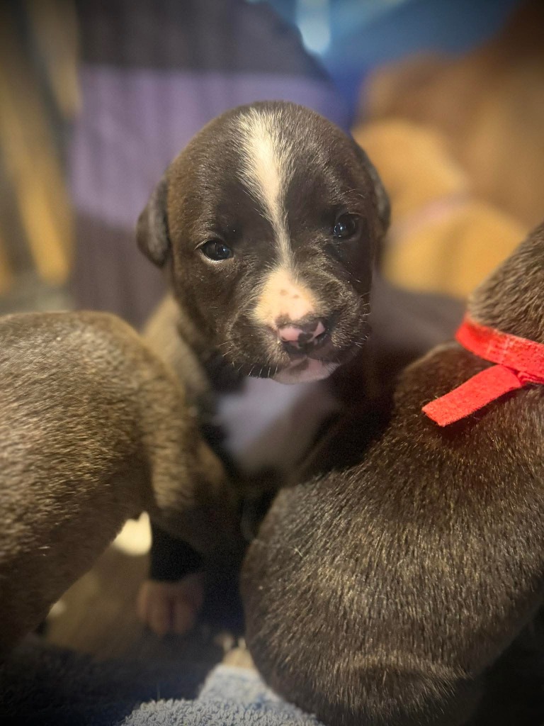This little one is part of a beautiful litter of 11 puppies (6 boys and 5 girls) who came into care with their mum, a gentle Staffy mix, when they were just a few days old. Dad is unknown. Each pup has grown into a happy, healthy, and sweet-natured youngster now looking for a family of their very own.