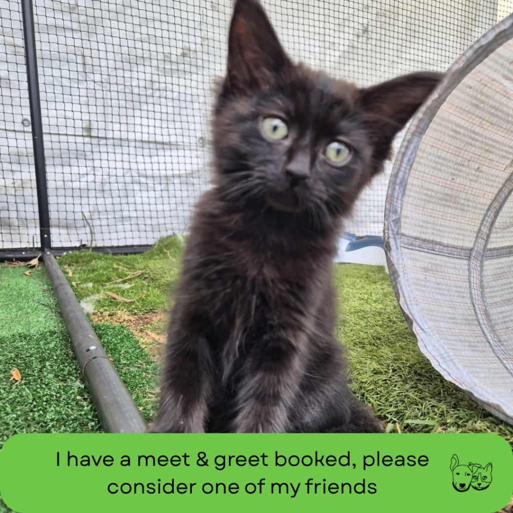 Meet Rhonda, a sleek little black kitten with a big personality and an even bigger heart. Part of an unwanted litter, she hasn’t let her rocky start slow her down one bit. Rhonda is confident, curious, and the first to explore anything new. She loves people, playtime, and curling up once she’s worn herself out. If you’re after a bold, friendly kitten who will grow into a loyal companion, Rhonda is your girl.