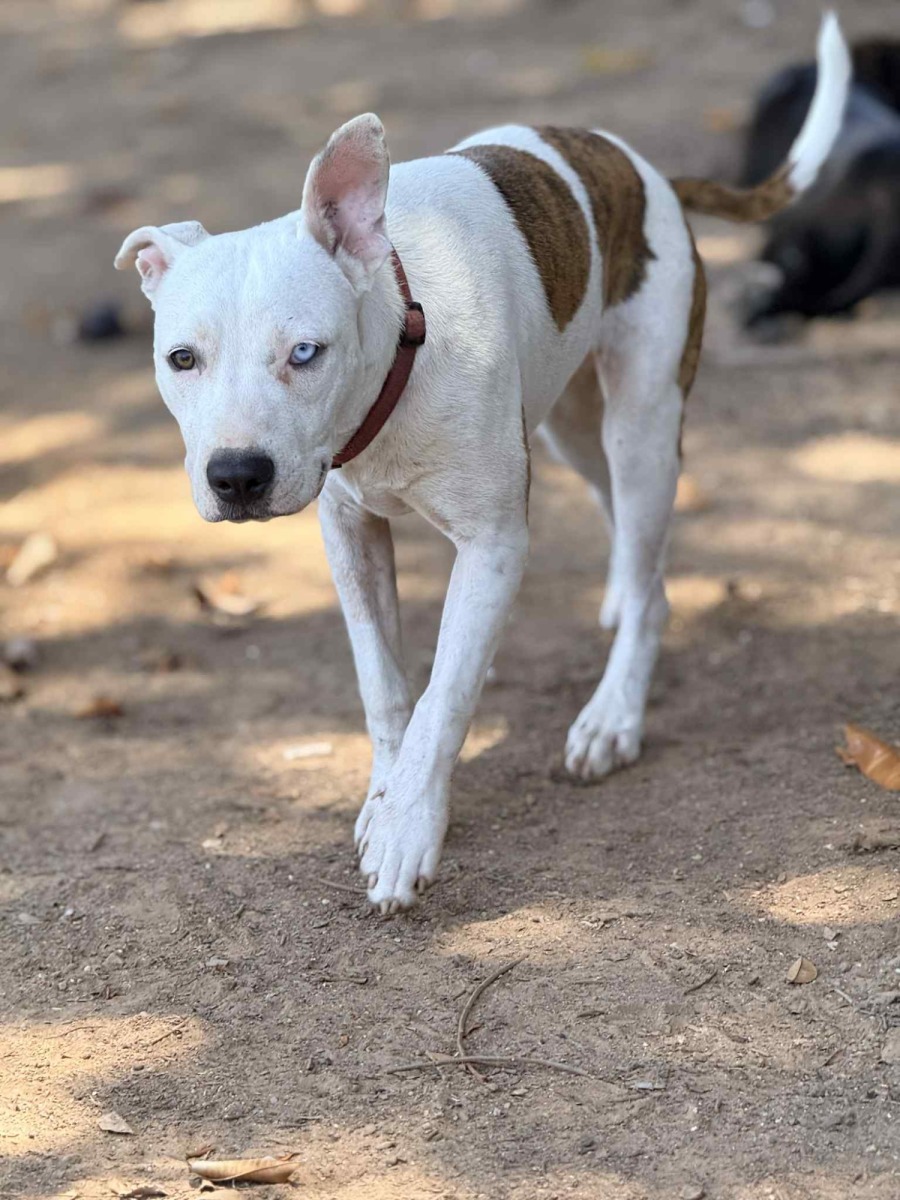 Meet Our Beautiful Two-Toned Princess Sassy – 7 Months Old & Full of Heart! Look at this face! This sweet young girl is approx 7 months old and already stealing hearts everywhere she goes. With her unique heterochromia (one warm brown eye and one striking icy blue eye), adorable floppy ears, and her big happy smile, she’s impossible not to fall in love with. She’s loyal, loving, and incredibly sweet — the kind of dog who wants nothing more than to be by your side. She’s highly food-motivated and eager to please, which helps make training easy. She genuinely wants to get things right for her people. Because she thrives on companionship, she’ll do best in a home with another dog or with a family who is home more often than not. Long stretches alone aren’t her thing — she’s a people-dog through and through. She’s great with kids, wonderful with other dogs, and not a dog who barks without reason. Despite her big personality, she’s not overly big in size, making her a manageable companion for many home types. This clever girl will need secure fencing, though — she’s smart enough to go exploring if given the chance and will happily take herself for a walk if the opportunity arises! If you’re looking for a bright, gentle, affectionate pup with a whole lot of charm (and the most stunning eyes you’ll ever see), she may be the perfect addition to your family. She’s ready for her forever home — maybe it’s yours?