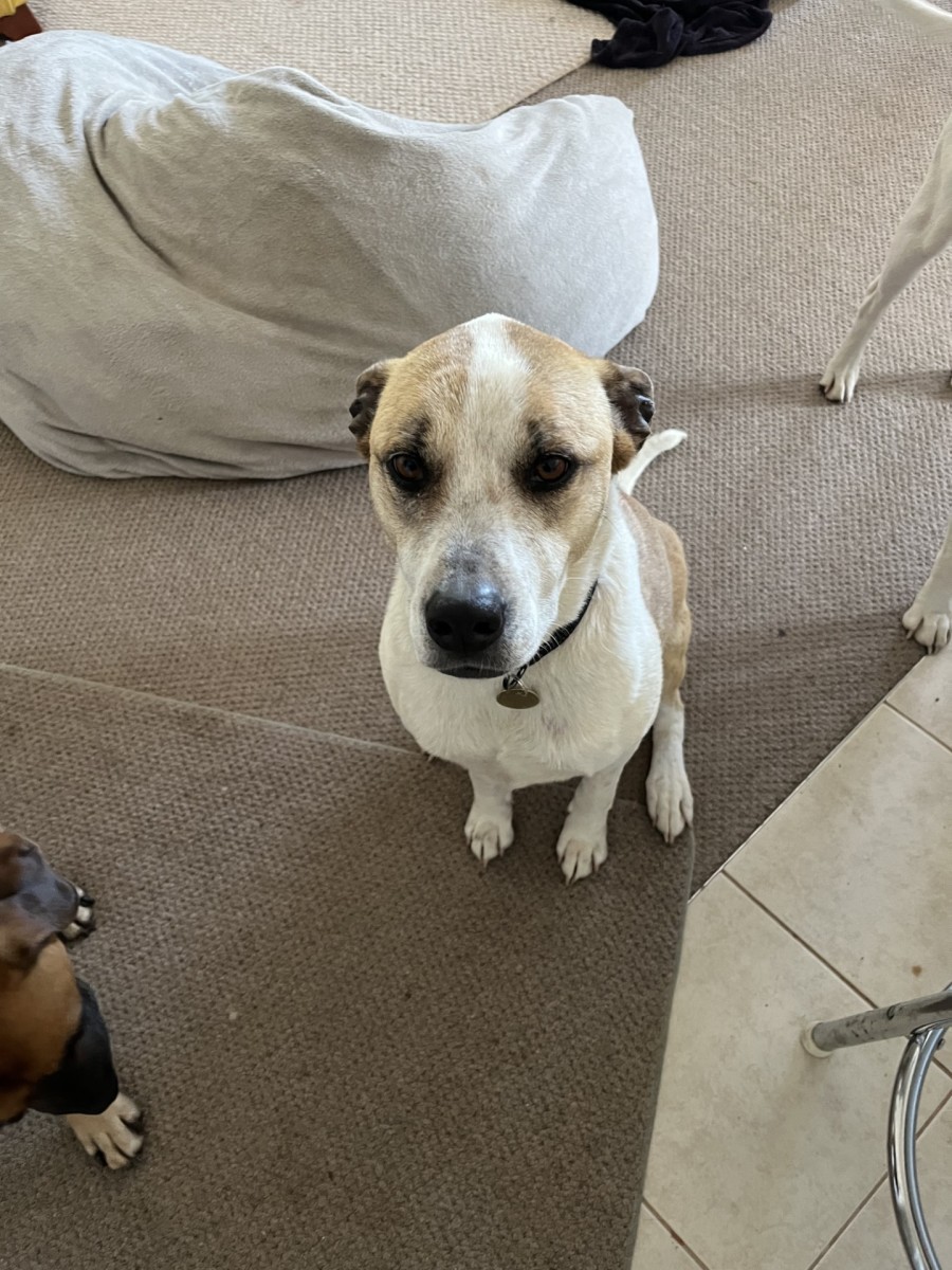 Currently she resides happily with 2 female staffies and a male bull mastiff. When we go out and come back, she is there at the gate to welcome us home with ‘smiles’ and tail wags.