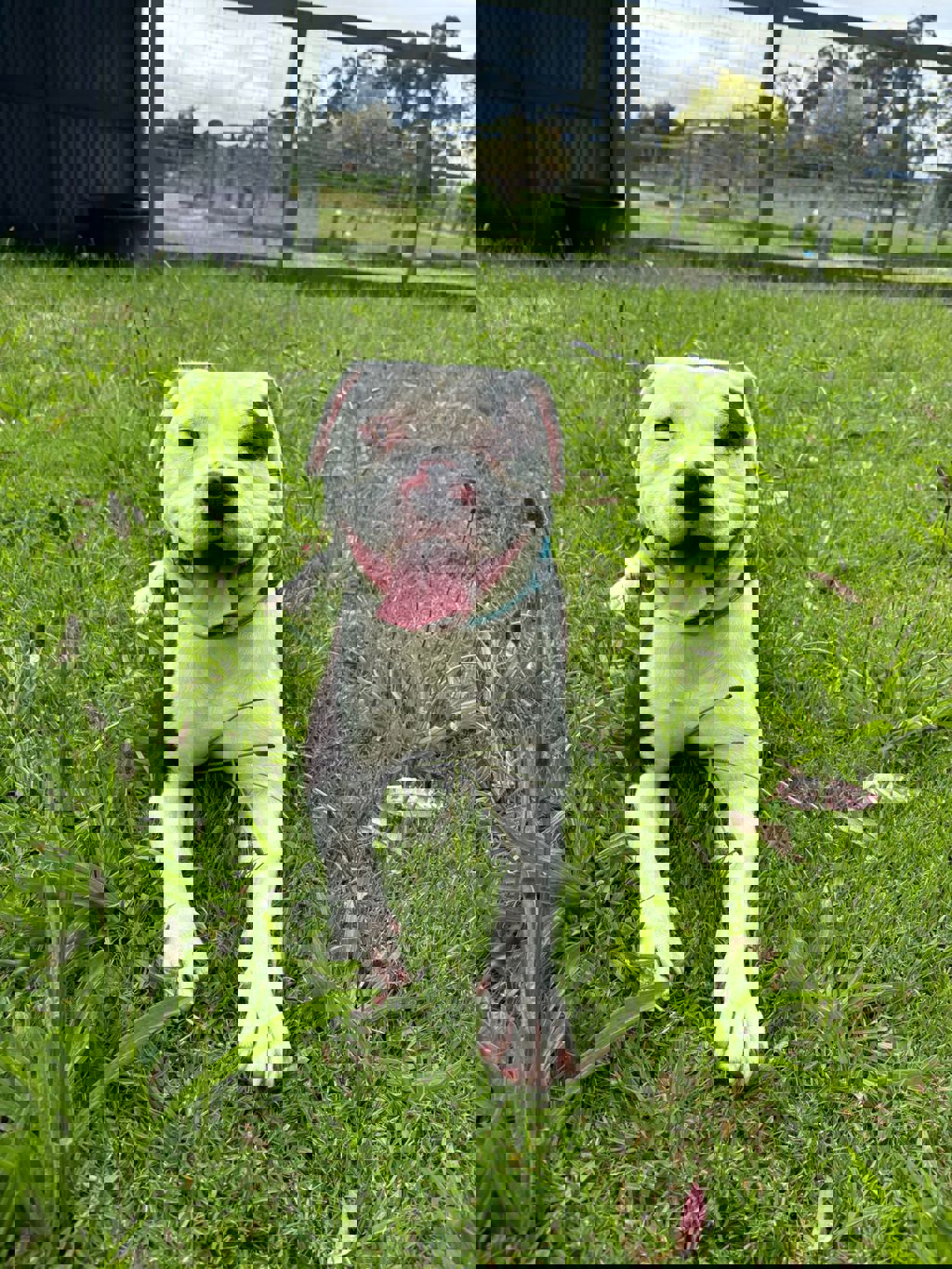 Koda is a charming 2-year-old American Staffy with a heart overflowing with affection and a whole lot of goofy charm. This big softie lives for his people and will happily shower you with cuddles, kisses, and endless funny moments.