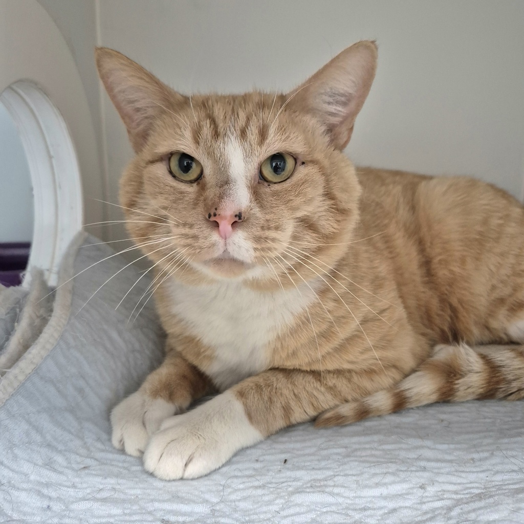 Hetfield is a handsome ginger-and-white gentleman with a big, burly frame and an even bigger heart. Despite his tough-guy name, he's truly a gentle soul who enjoys peaceful days and soft places to rest.