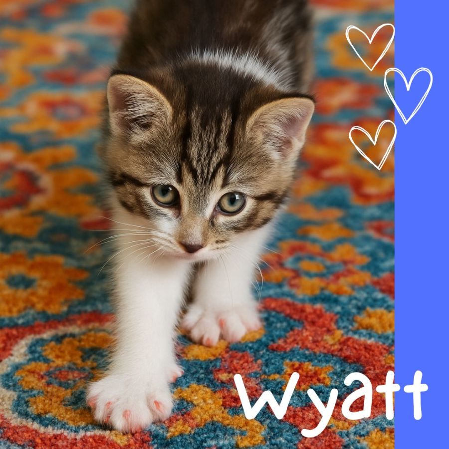 Wyatt is growing into a seriously sensational kitten. He loves humans, loves playtime, loves snuggles, and especially loves being involved in whatever you're doingβ¦ even if you didnβt invite him. Need help typing? Heβs on it. Making a cup of tea? Heβll supervise. Trying to wrap Christmas presents? Good luck β he is the present.