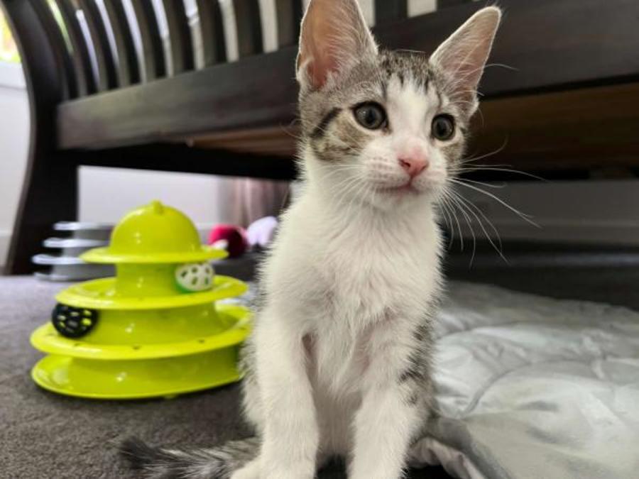Ash is a bold and busy little grey and white tabby boy who brings laughter everywhere he goes. He loves to play, pounce and explore — often waking up his sleeping siblings when he’s ready for fun.
