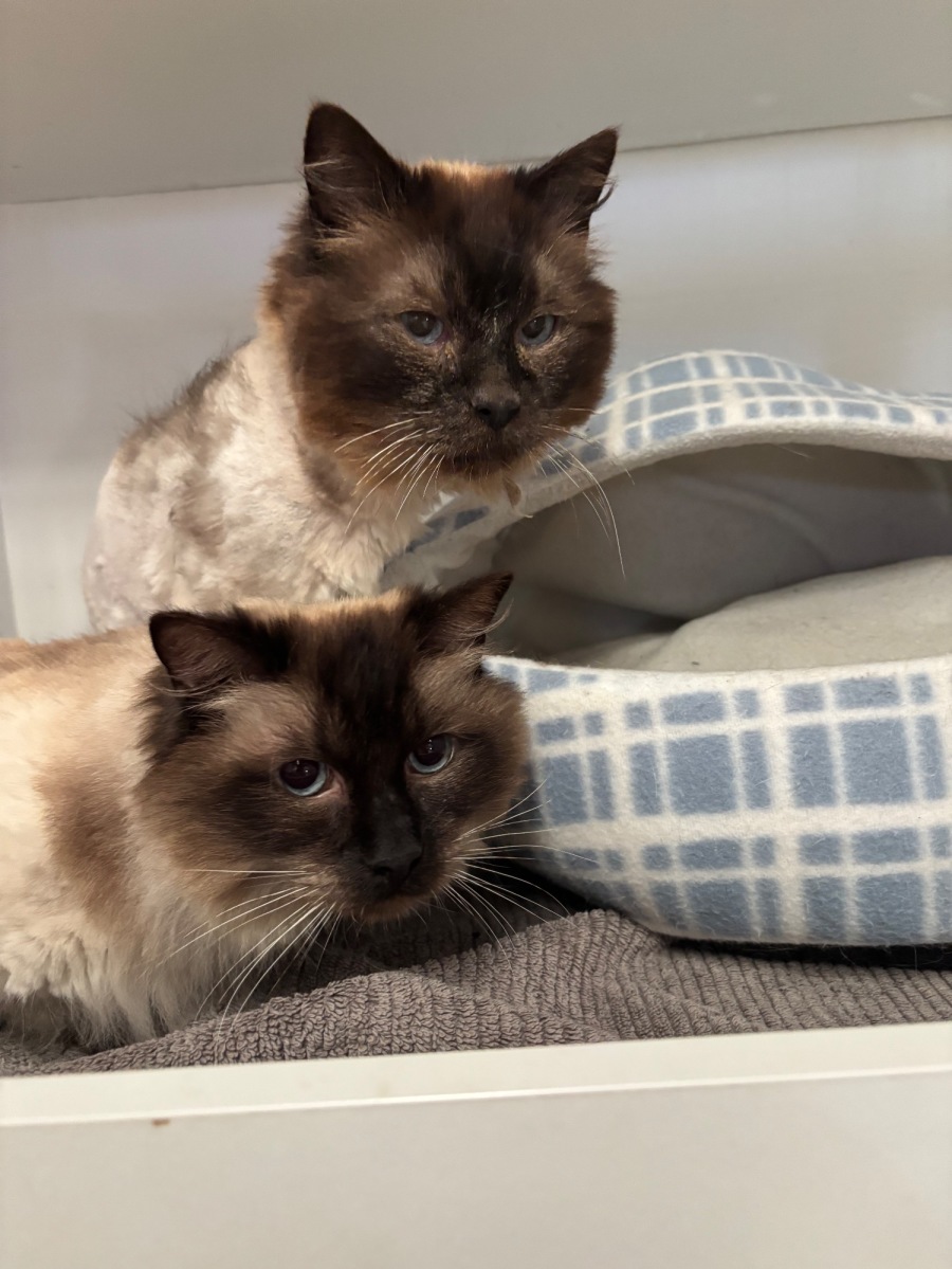 Both ex breeding cats and surrendered to a regional shelter in poor condition , both required full body shaves due to being so matted.