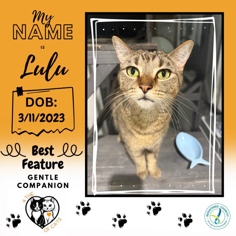 This beautiful 2-year-old brown tabby has already won our hearts, and she’s ready to win yours too! LuLu was rescued from Rockhampton pound, and we’re incredibly grateful to Central Queensland Animal Society Inc - CQASI for helping her out of the pound and navigating her safe journey to Cairns. Now fully desexed, microchipped, and vaccinated, LuLu is an easygoing sweetheart with a gentle chatter that will melt your heart. She’s loving, low-maintenance, and simply pleasant to be around – the kind of cat who fits seamlessly into your life and makes every day a little brighter. LuLu gets along wonderfully with other cats and children, making her perfect for families or multi-pet households. If you’re looking for a sweet, affectionate companion who’s easy to love and a joy to have around, LuLu is waiting to meet you.