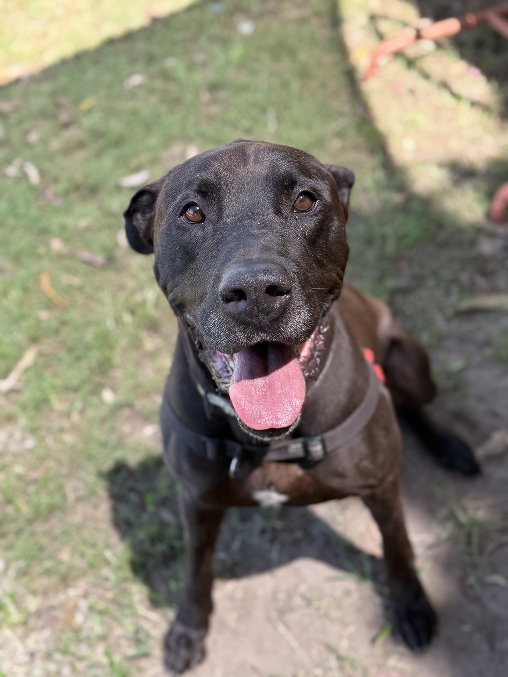 Frankie is a big, love‑soaked goofball wrapped in a mature dog body with a puppy heart. He adores being glued to his humans, leaning his whole giant self into you for affection, and - yes - trying to sneak onto your bed at night (he can settle if the bedroom door is closed!). He's also a professional couch‑hog, drool‑rag model, and enthusiastic water‑splasher. Frankie can be quite stressed and drooly when first in the home, a drool rag comes in handy for that settling in period.