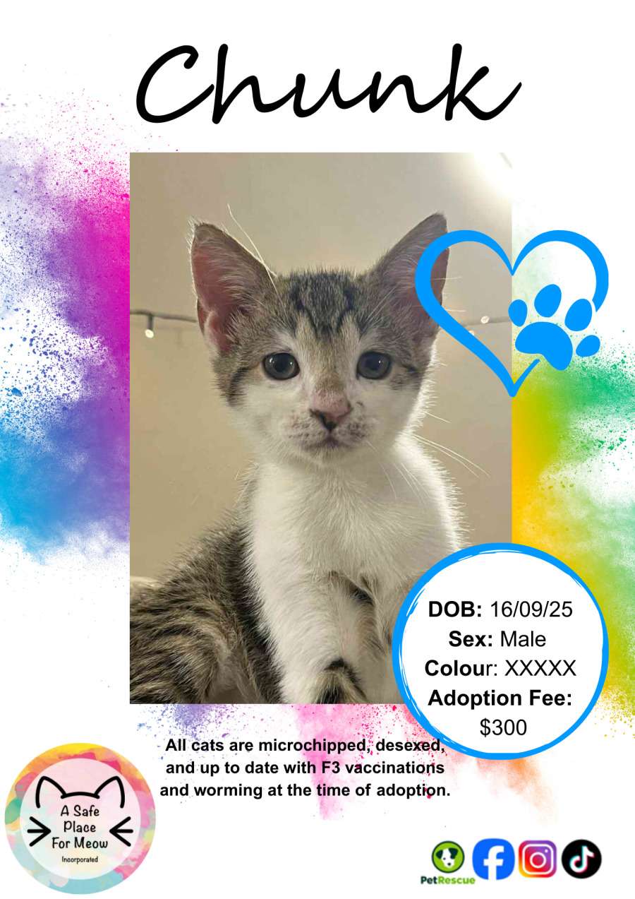 Meet Chunk, the epitome of a calm and cuddly feline companion. Chunk is a delightful puffball who radiates warmth and serenity, making sure everyone in the household feels loved and relaxed. If it's comfort and tranquility you're seeking in a pet, this charming cat might just be the purr-fect fit for your family.