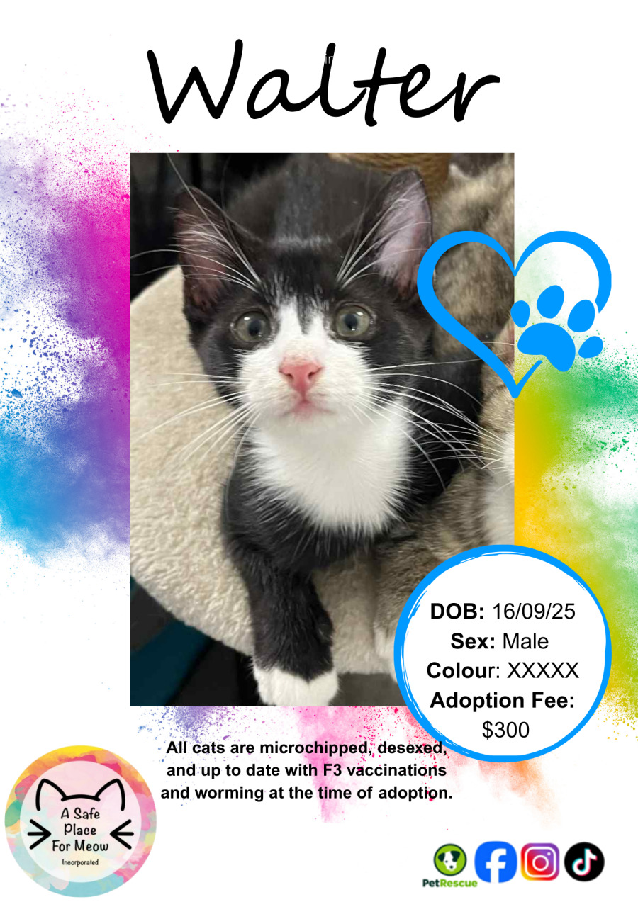 Walter has a huge appetite for both food and affection. Always ready for a meal, he is happiest when his food bowl is full, and his cuddly nature ensures that you're never without a loving snuggle companion. Whether it's chasing a toy around the living room or curling up for a cozy nap on a comfy couch, Walter knows how to balance his zest for life with moments of peaceful relaxation.
