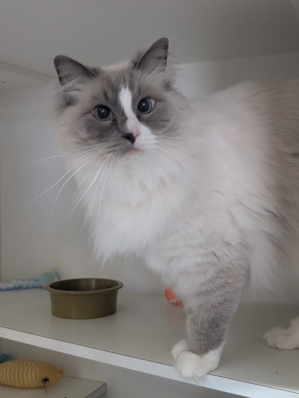 Because he's a Ragdoll, regular grooming is essential to keep his beautiful coat healthy and tangle-free. Boots doesn't mind brushing and will appreciate the extra bonding time it brings.