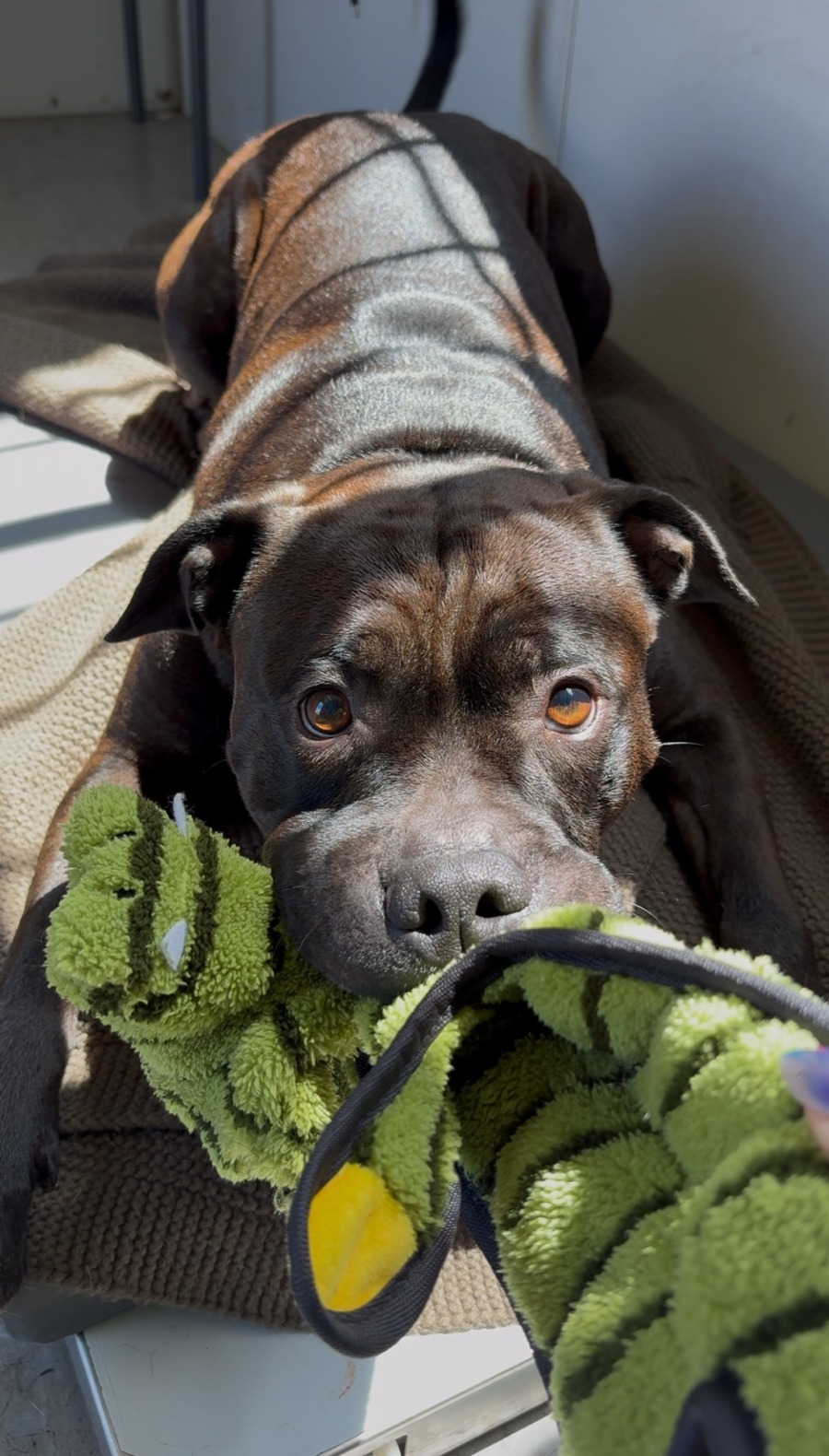 Meet Tonka, an almost three-year-old Staffy x Shar Pei with a heart as big as his ears. This gentle fellow may be nervous when meeting new people, but with a little patience and understanding, you'll discover the affectionate and playful dog that lies beneath. Once he feels comfortable, he will be by your side, ready to shower you with love.