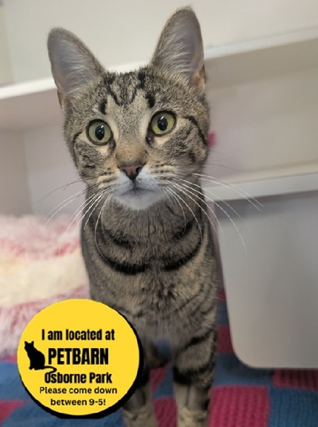 Amber is an adorable 11-month-old tabby with some of the most unique, expressive eyes you'll ever see. Her gaze is full of curiosity, warmth, and a little bit of mischief - it's impossible not to fall in love the moment she looks your way.