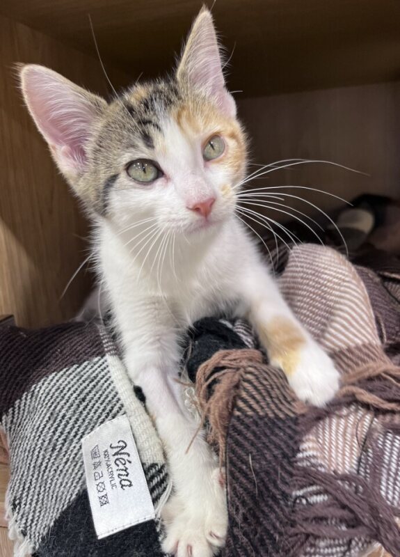 Fifi is a stunning calico beauty with a personality as colorful as her coat. With bright, expressive eyes and a gentle curiosity, she approaches the world with a perfect blend of confidence and charm. She’s the kind of kitten who will trot over to greet you, tail up, ready for affection or a brand-new adventure.