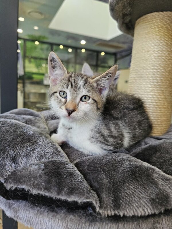 Hey there, I'm Mori. I’m a friendly and affectionate kitten who would suit most homes! My playful paws are always ready to pounce on anything that moves. I love playing with wand toys and mysterious shadows on the wall! When I’m finished playing, I love nothing more than finding a warm lap to curl up in. I have perfected the art of the irresistible purr. It's like my secret weapon for getting all the cuddles and chin scratches I could ever want. Life's just one big, exciting string of moments, and I'm here to make every second count – whether I'm chasing my tail or sharing some purr-fectly quiet time with my favourite humans. So, if you're up for a bundle of furry fun and a lifetime of companionship, please consider adopting me!