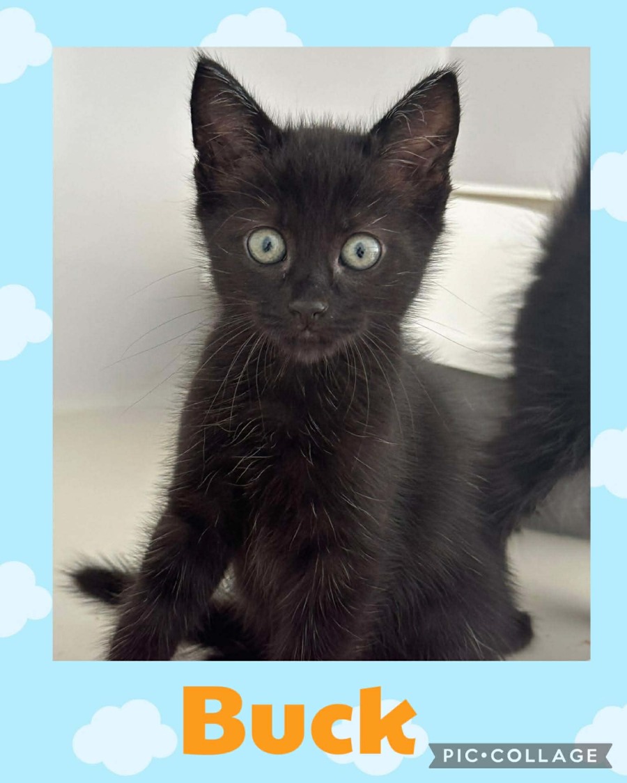 Meet Buck, a delightful young kitten with sleek black fur that glistens in the sunlight. Bursting with energy and curiosity, Buck is a playful little guy who turns everything into an adventure. His playful spirit and charming antics are sure to bring laughter and joy into your home. Buck recently arrived at the pound with his sister, and together they've been exploring life’s great adventures.