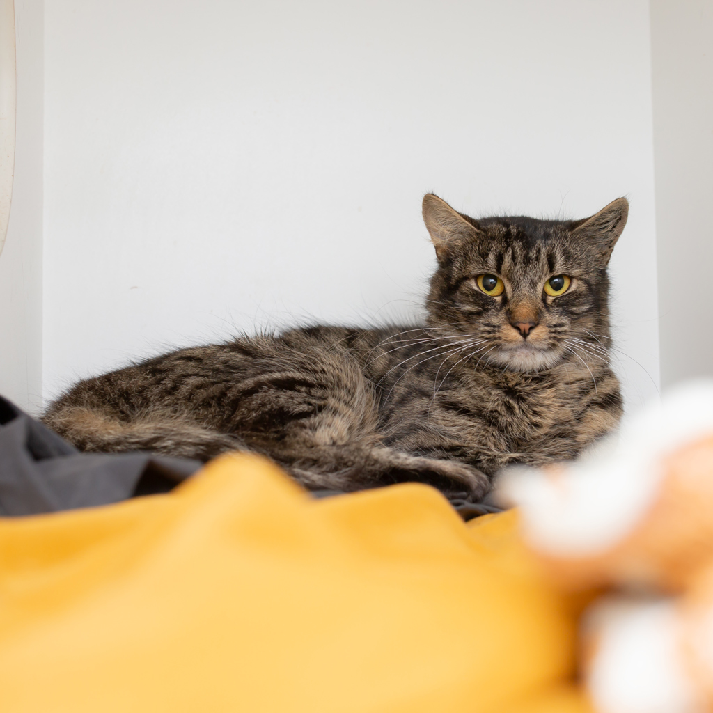 Brittney is a beautiful tabby girl who's still getting used to life in the shelter. Everything is a little new right now, so she appreciates calm, quiet moments where she can relax and observe the world at her own pace.