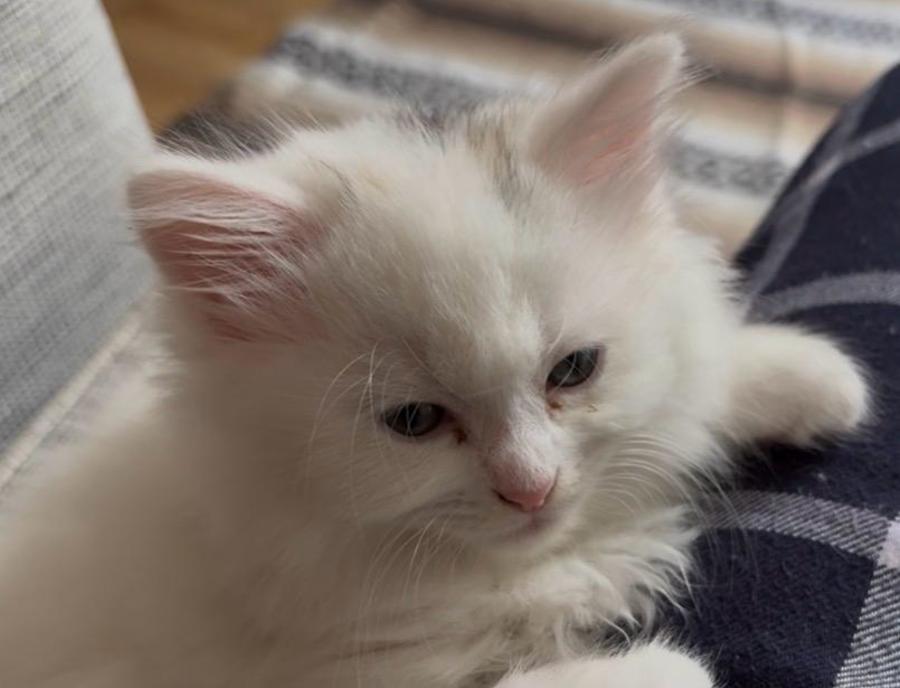 ☁️ Casper is a little cloud on legs, with long white fluffy fur and an adorable black smudge right in the middle of her head—like a tiny storm cloud brewing with mischief. Her bright green eyes and cute stubby tail make her truly one-of-a-kind.