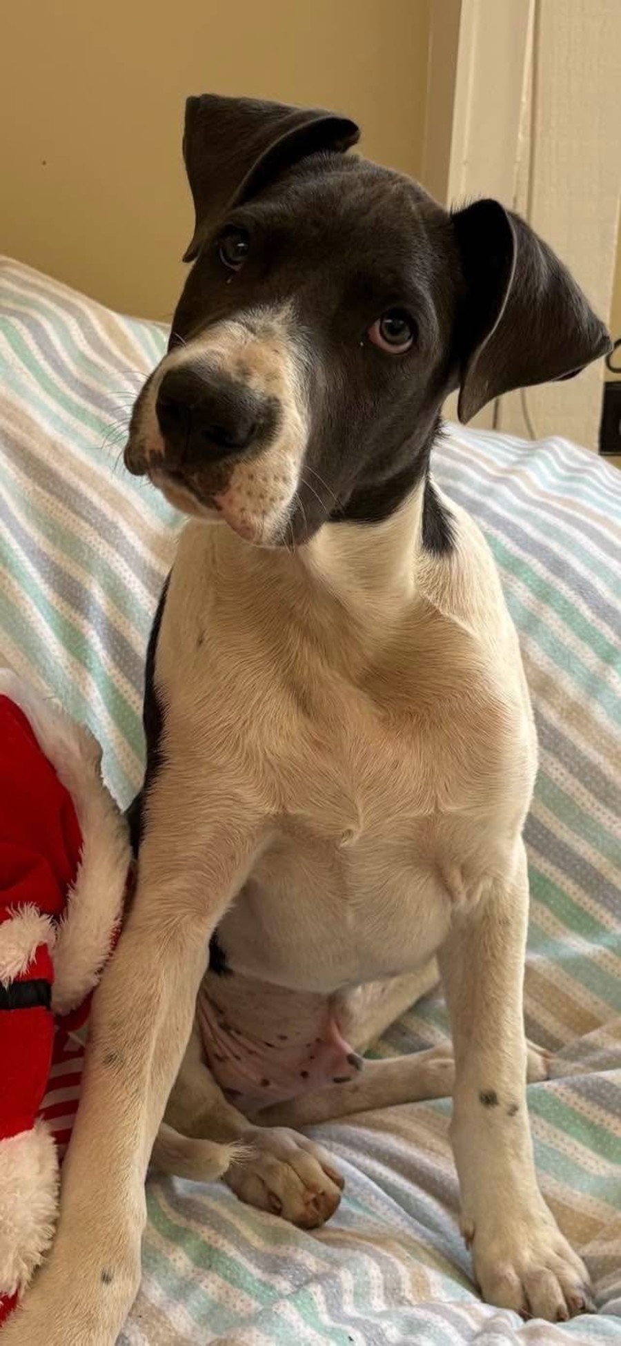 Bandit is a fun, playful, typical puppy who loves exploring the world and making friends wherever he goes. He's great with other dogs, good with cats and children, making him a wonderful addition to almost any family. He loves his canine friends so much, he needs to be rehomed with another dog. His goofy antics and sweet nature are guaranteed to make you smile every single day.