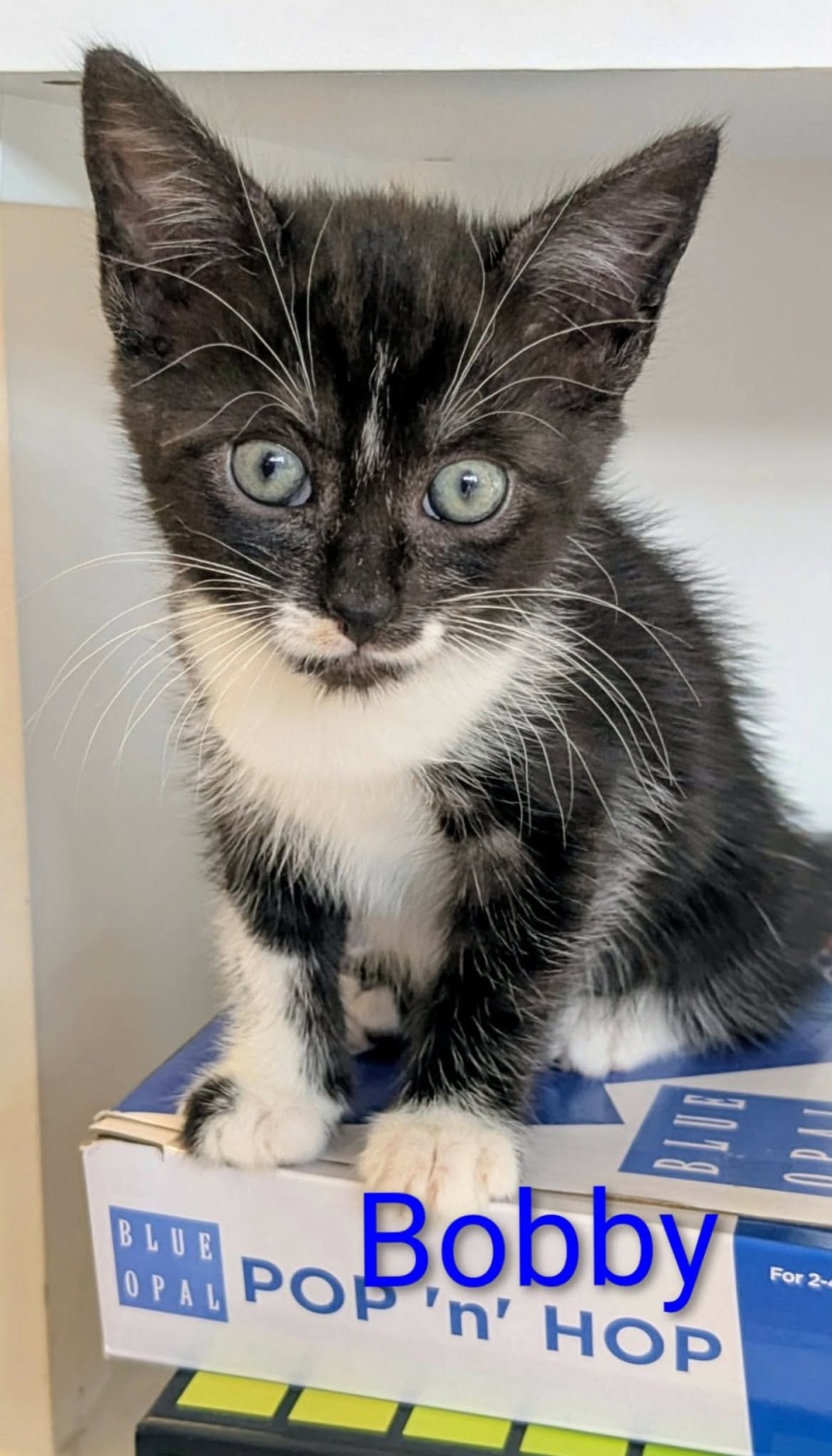 Bobby must go to a home with an existing cat or be adopted with one of his equally as adorable siblings Bertie, Daisy or Bolt. Kittens do much better with a little friend. It is worth researching "solo kitten syndrome" to learn why.