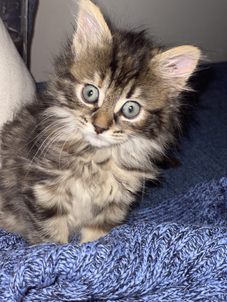 Karrie is a tiny kitten with a huge personality - sassy, fearless, and always ready for fun. She has endless energy and could play for hours, zooming around the house and exploring every corner with her bold little stride. She's incredibly vocal and loves to chat with her humans, making her the perfect companion if you enjoy a talkative kitty. When she's not busy playing or telling you about her day, Karrie is a big foodie who will happily remind you when it's mealtime.