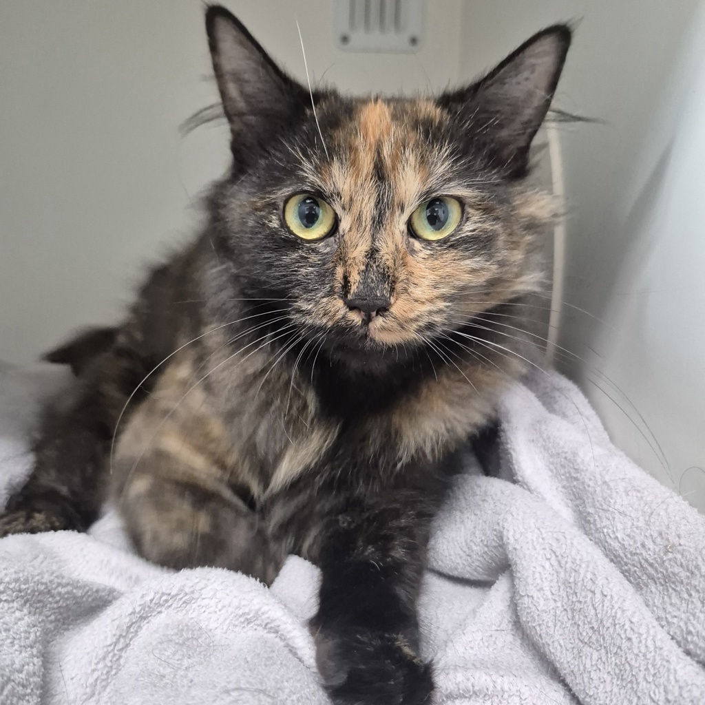 Queen Starlight is a gorgeous medium-haired black tortoiseshell with a truly regal presence and a heart that's just beginning to uncover the comfort of kindness. She came to the shelter as a frightened stray mum caring for her kittens, and while she's safe now, she's still learning that people can be gentle, patient, and loving.