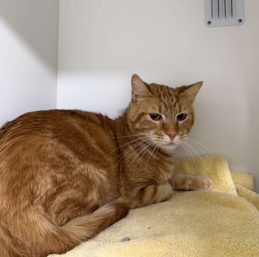 Melon is a handsome shorthair ginger tabby with a soft personality and an even softer heart. He's spent his life indoors, is fully toilet-trained, and has perfect manners. Once he feels comfortable, Melon blossoms into an affectionate, loving companion who enjoys gentle cuddles, quiet company, and being near his favorite people.