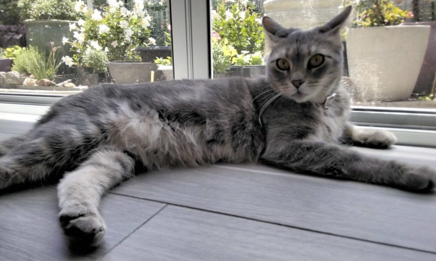 She has a beautiful soft grey tabby coat and doesn't mind a gentle brush.