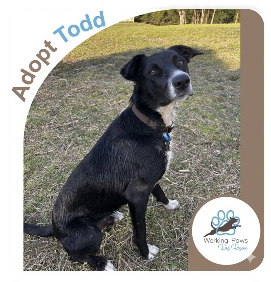 Hi, my name is Todd! Iām a 1-year-old Collie mix (Collie x Kelpie x Koolie) with loads of energy, smarts, and charm. Iām very social, love meeting people and dogs, and Iām always ready for fun.