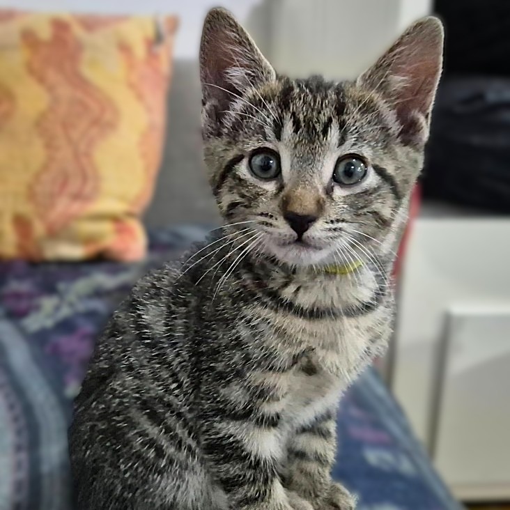 He’s the biggest smoocher of his sibling squad and absolutely adores cuddling as close as physically possible. When he’s not melting hearts, you’ll find him happily playing with the other kittens, charming everyone with his sweet and social nature.