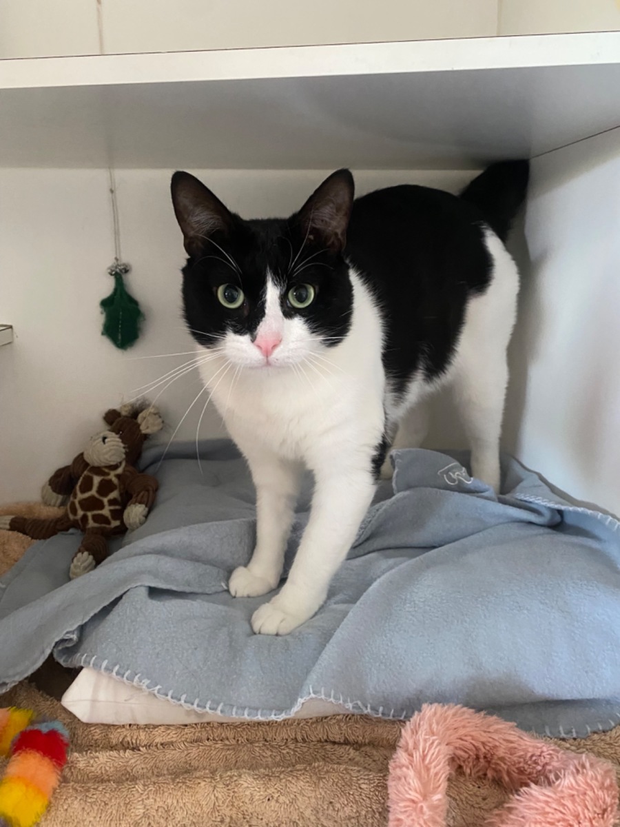 Our beautiful male black and white DSH is roughly 2 years old.