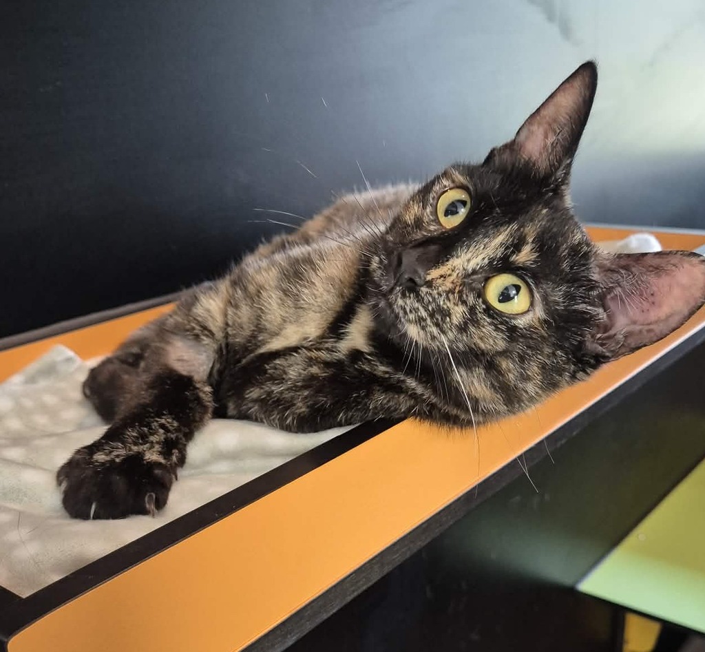 Peanut is a striking black tortoiseshell whose personality shines as brightly as her coat. She is affectionate and friendly, always ready to share her love, yet she carries an independent streak that makes her wonderfully easy-going. Peanut has a quirky fondness for roast chicken, which never fails to bring out her playful side and adds to her charm.