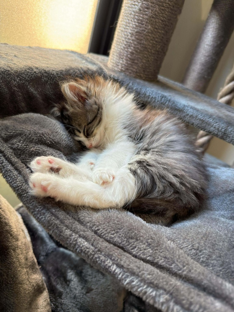 She loves to bunny-kick her soft toys, wrestle with her sister, and climb up her cat post to explore or find the perfect cozy spot for a daytime nap. Her playful energy is balanced with sweet, gentle cuddles, making her an absolute delight to watch and be around.