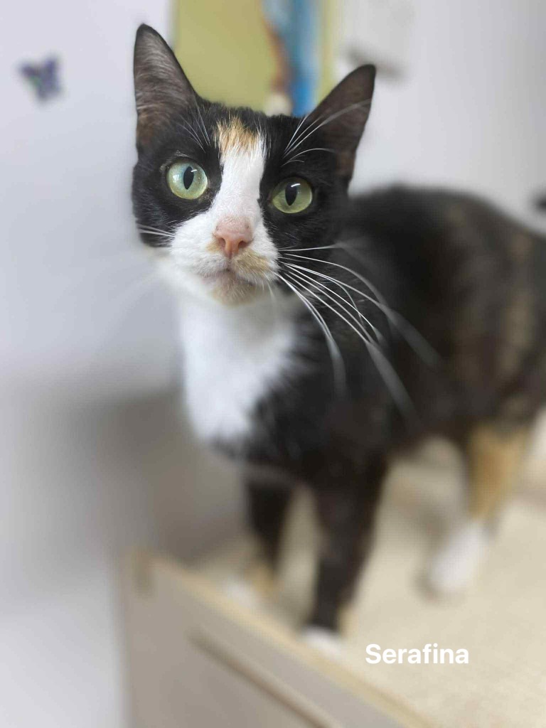Introducing Serafina, an angelic feline whose name suits her perfectly. Serafina is a beautiful calico cat with stunning mosaic coloring that is as captivating as her warm personality. She's a vision of elegance and charm, wrapped up in a vibrant coat.