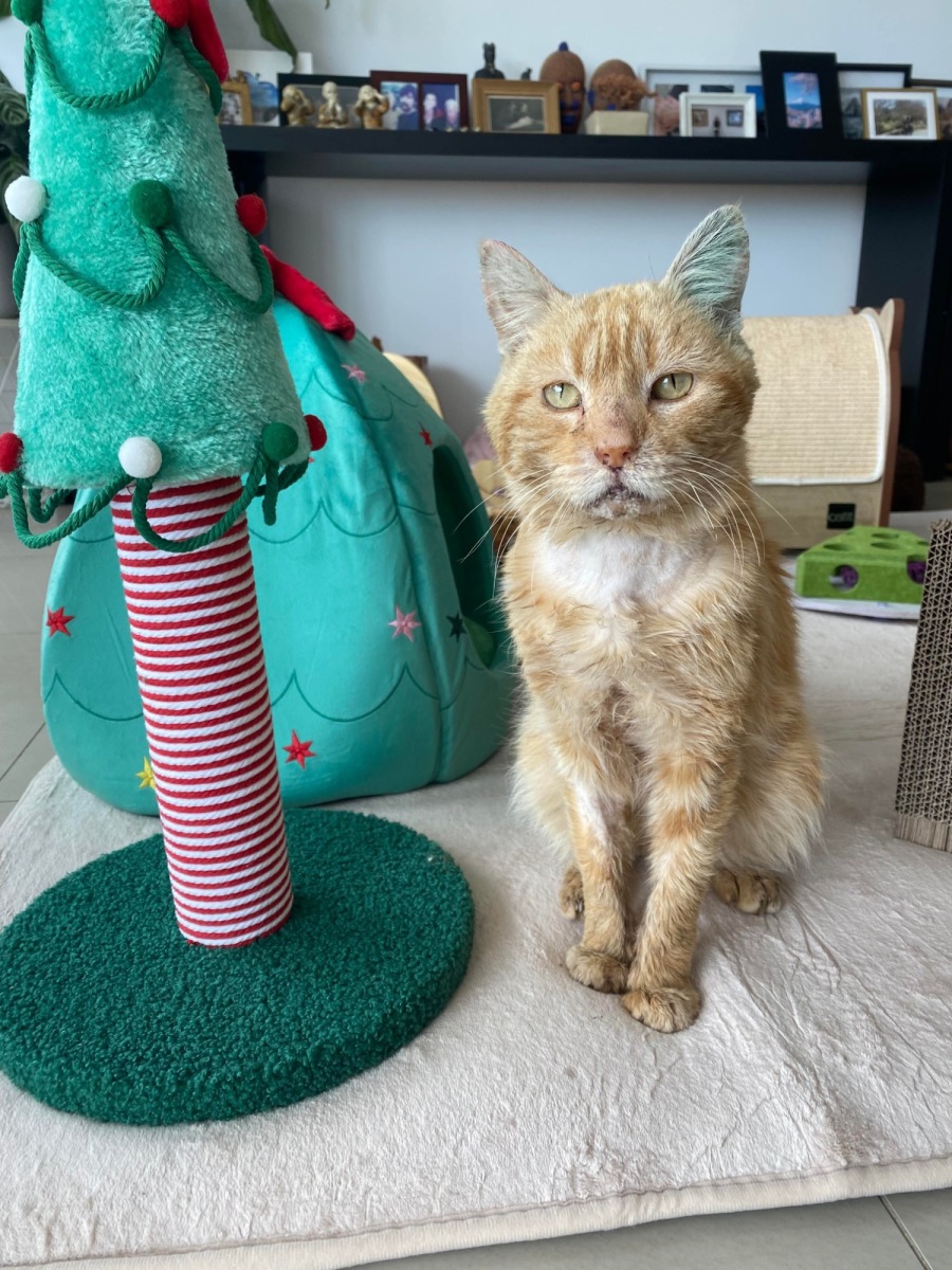 He will happily flop on you for a cuddle, give you gentle head boops, purr away and happily watch the world go around with you. A little cat who has clearly had a very tough start and is so appreciative of everything.