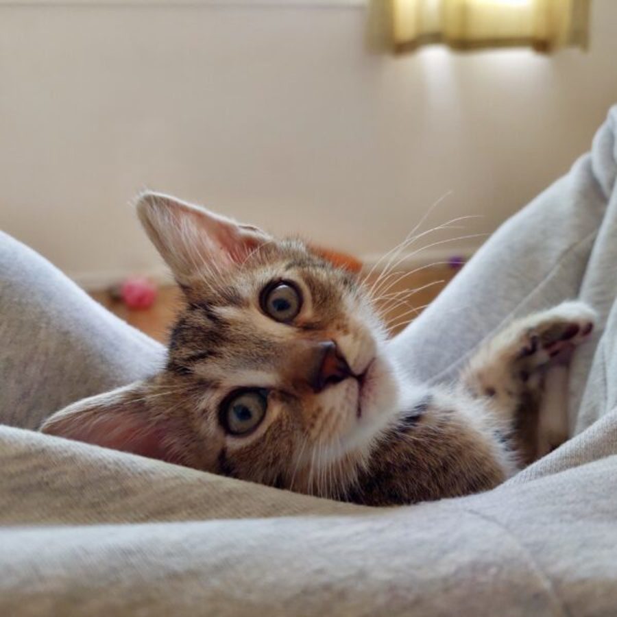 Tub is a 3-month-old tabby boy who came into care with his mum and four siblings when he was just a week old. He’s full of kitten energy, and once he’s had a good run around, he loves nothing more than curling up on a warm lap. Tub is an expert nest-builder and will happily make himself a cosy little spot wherever he decides is snuggliest.