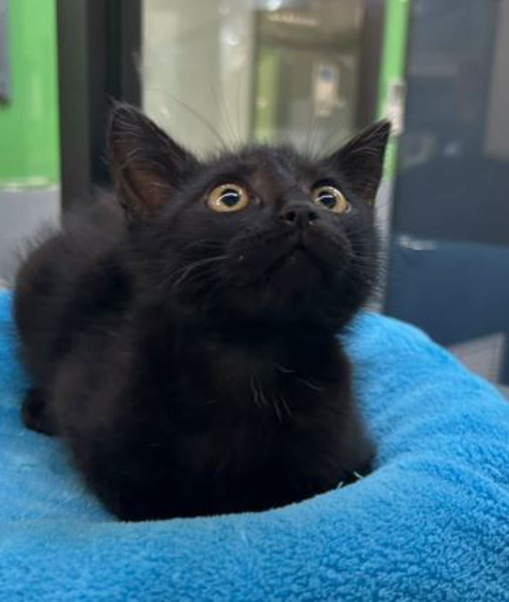Silky is a 10-week-old black kitten with a silky smooth coat and big, wondering eyes that take in the whole world. He may be small, but he's already showing a brave, curious spirit that grows every day.